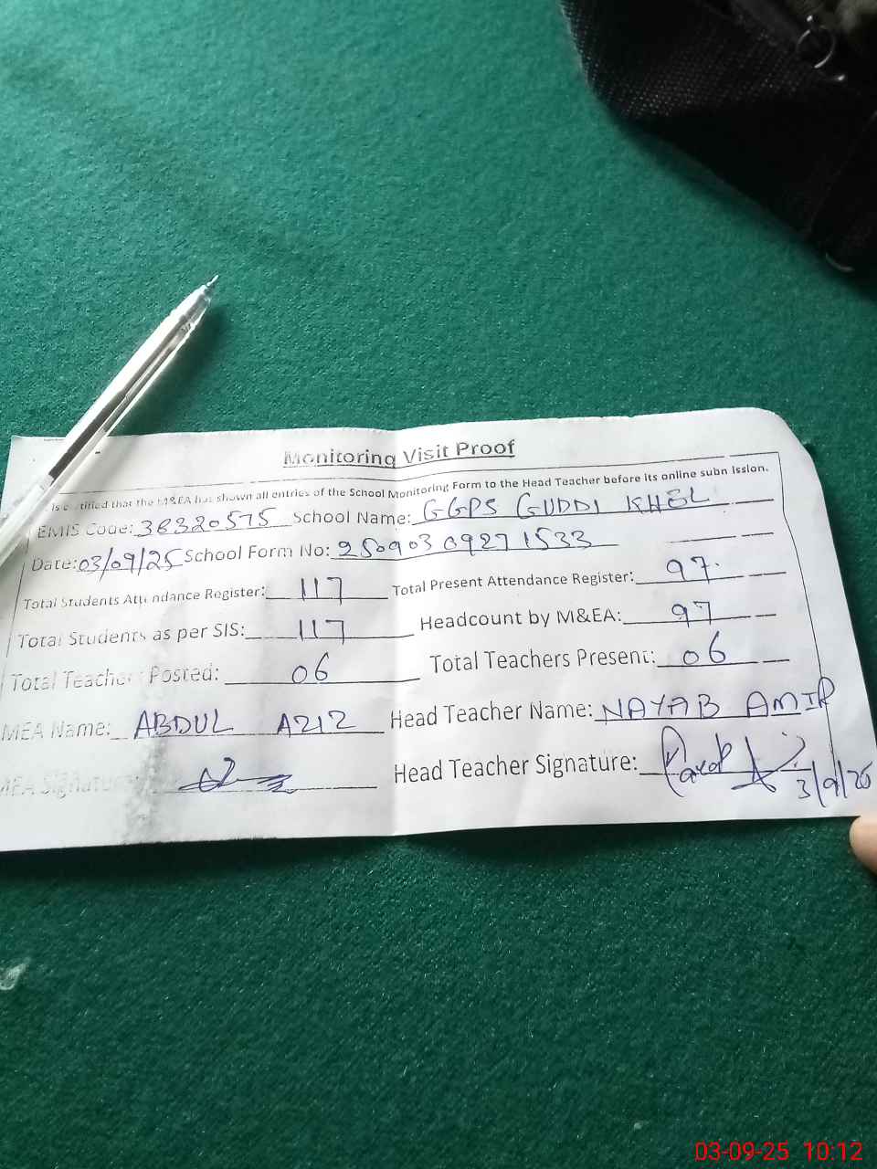 | Attendance Register | Head Teacher | MEA with School | Visit Proof |