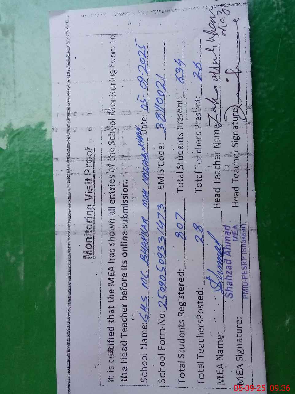 | Attendance Register | Head Teacher | MEA with School | Visit Proof |