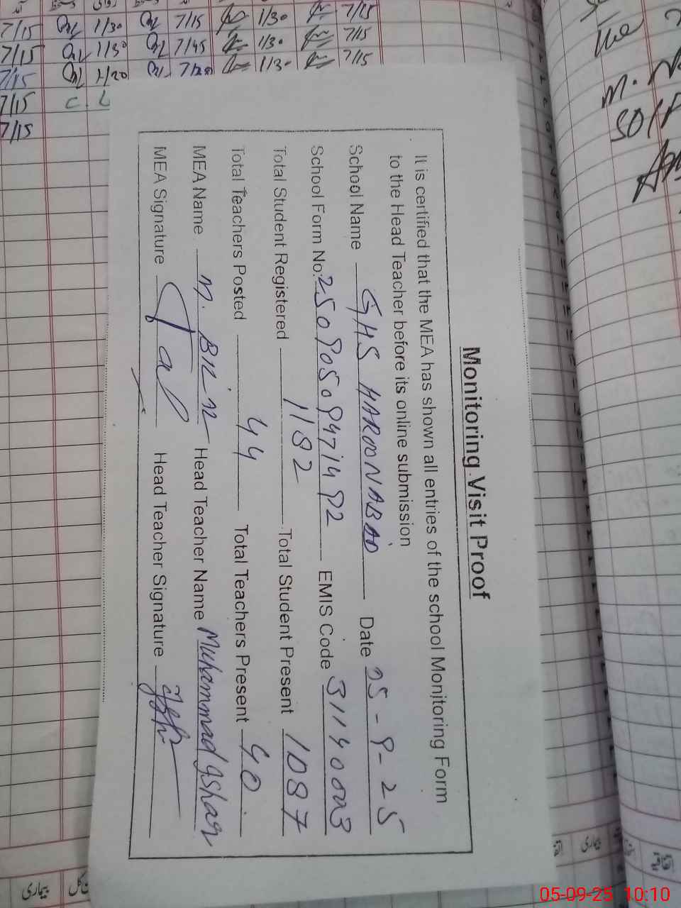 | Attendance Register | Head Teacher | MEA with School | Visit Proof |