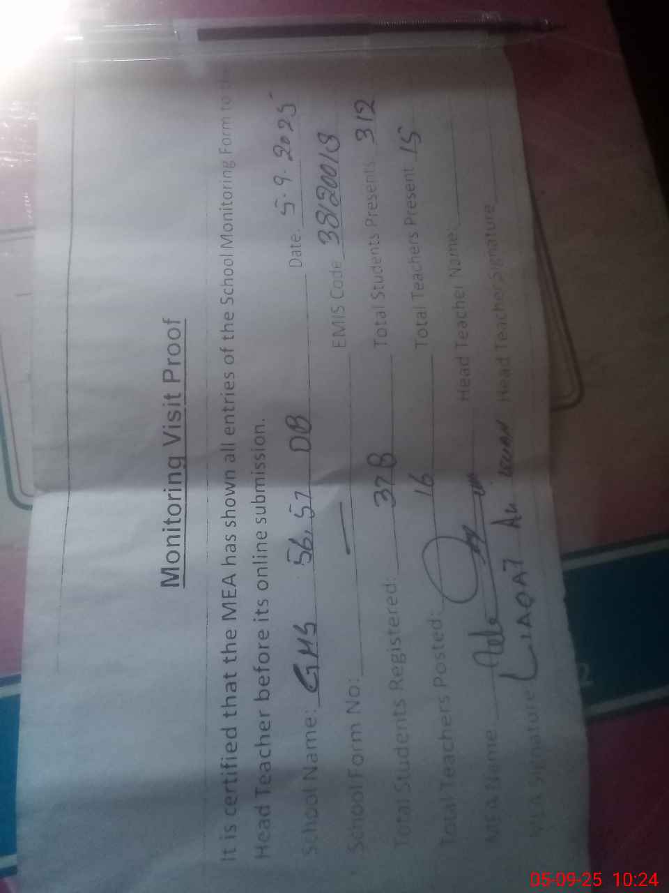 | Attendance Register | Head Teacher | MEA with School | Visit Proof |