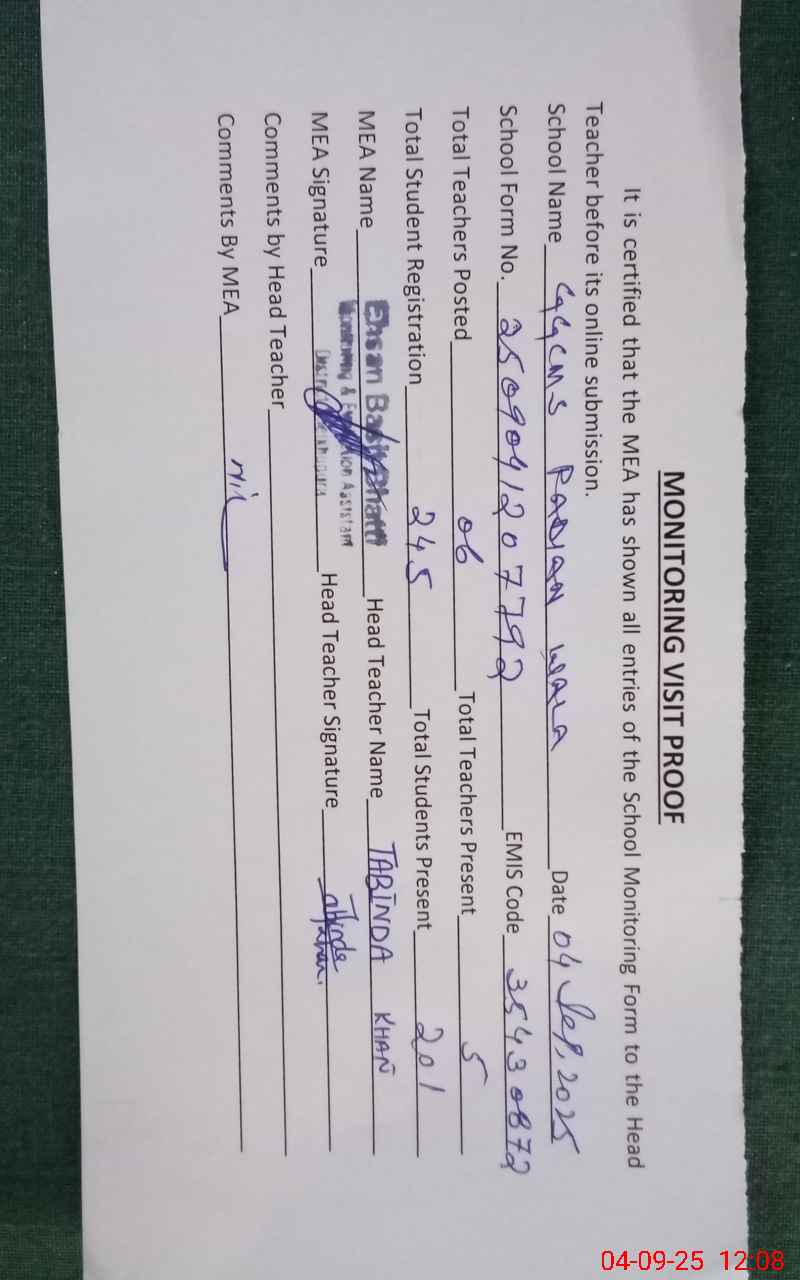 | EMIS Code: 35430872 | Name of School: GGCMS PADIAN WALA | |||