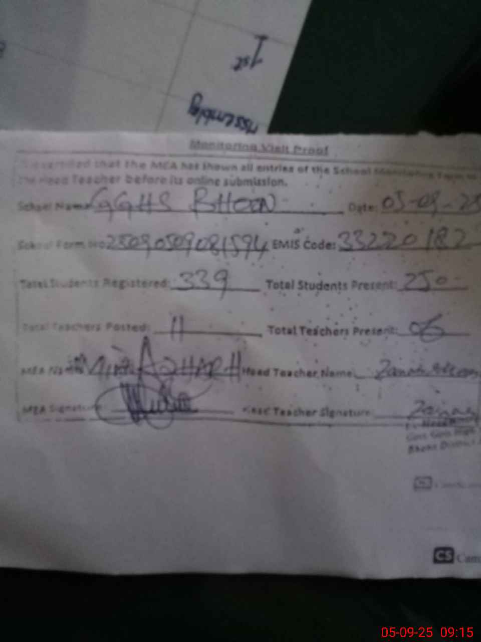 | Attendance Register | Head Teacher | MEA with School | Visit Proof |