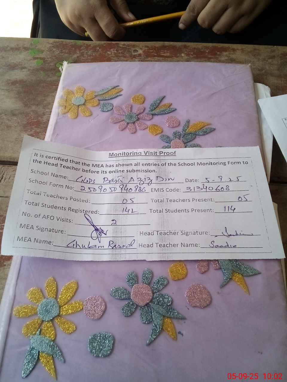| Attendance Register | Head Teacher | MEA with School | Visit Proof |