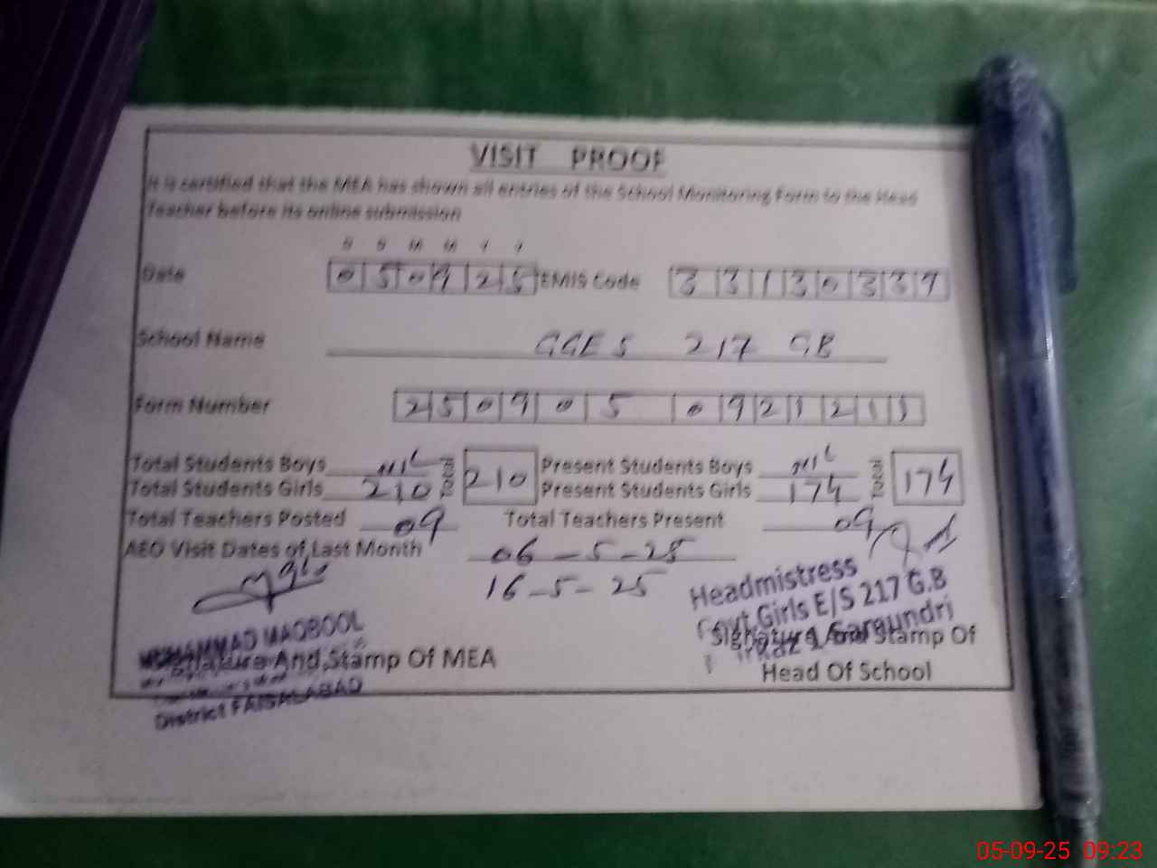 | Attendance Register | Head Teacher | MEA with School | Visit Proof |
