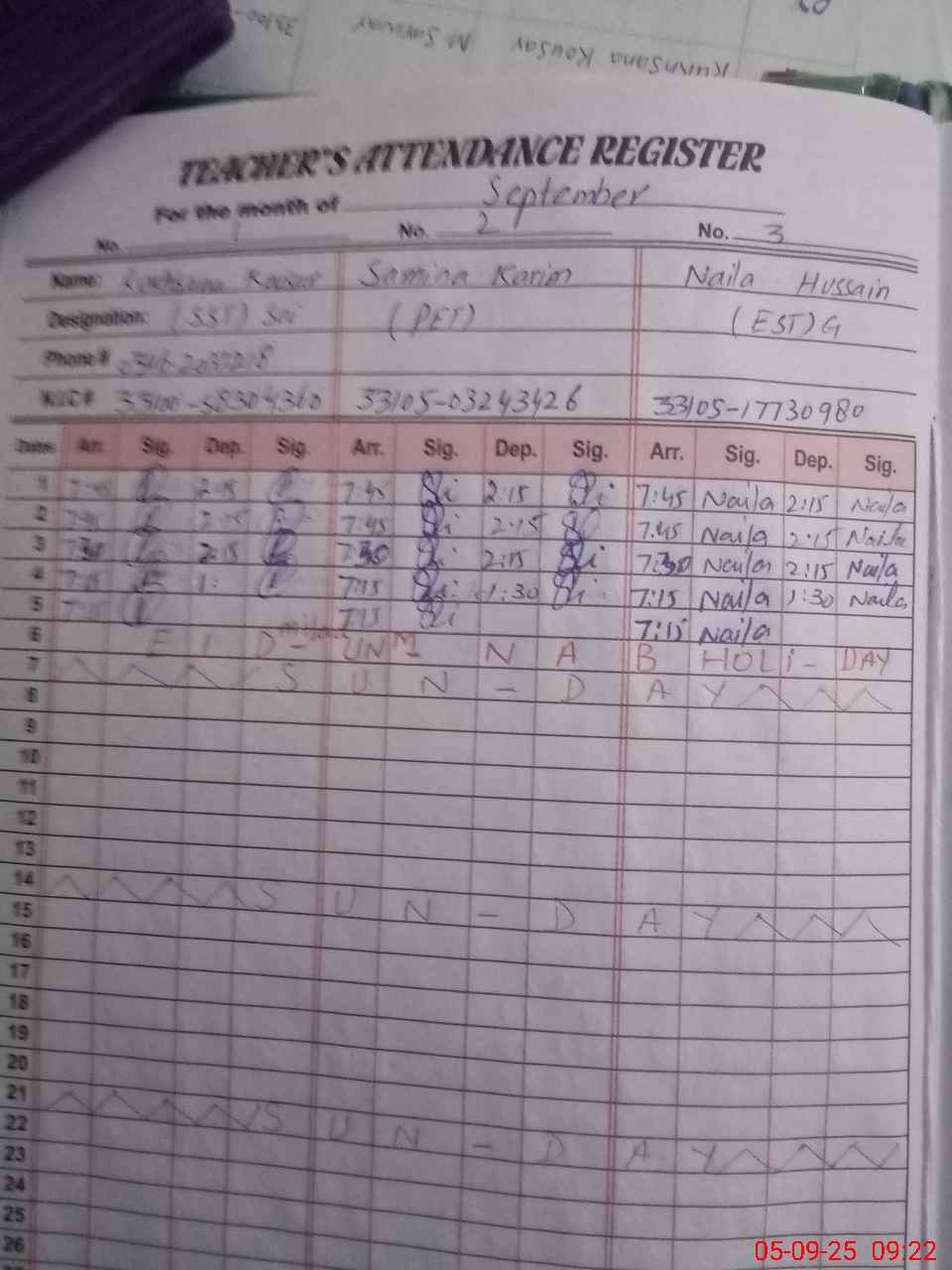 | CNIC | Full Name | Designation | R/C | Absence during last cal. month |