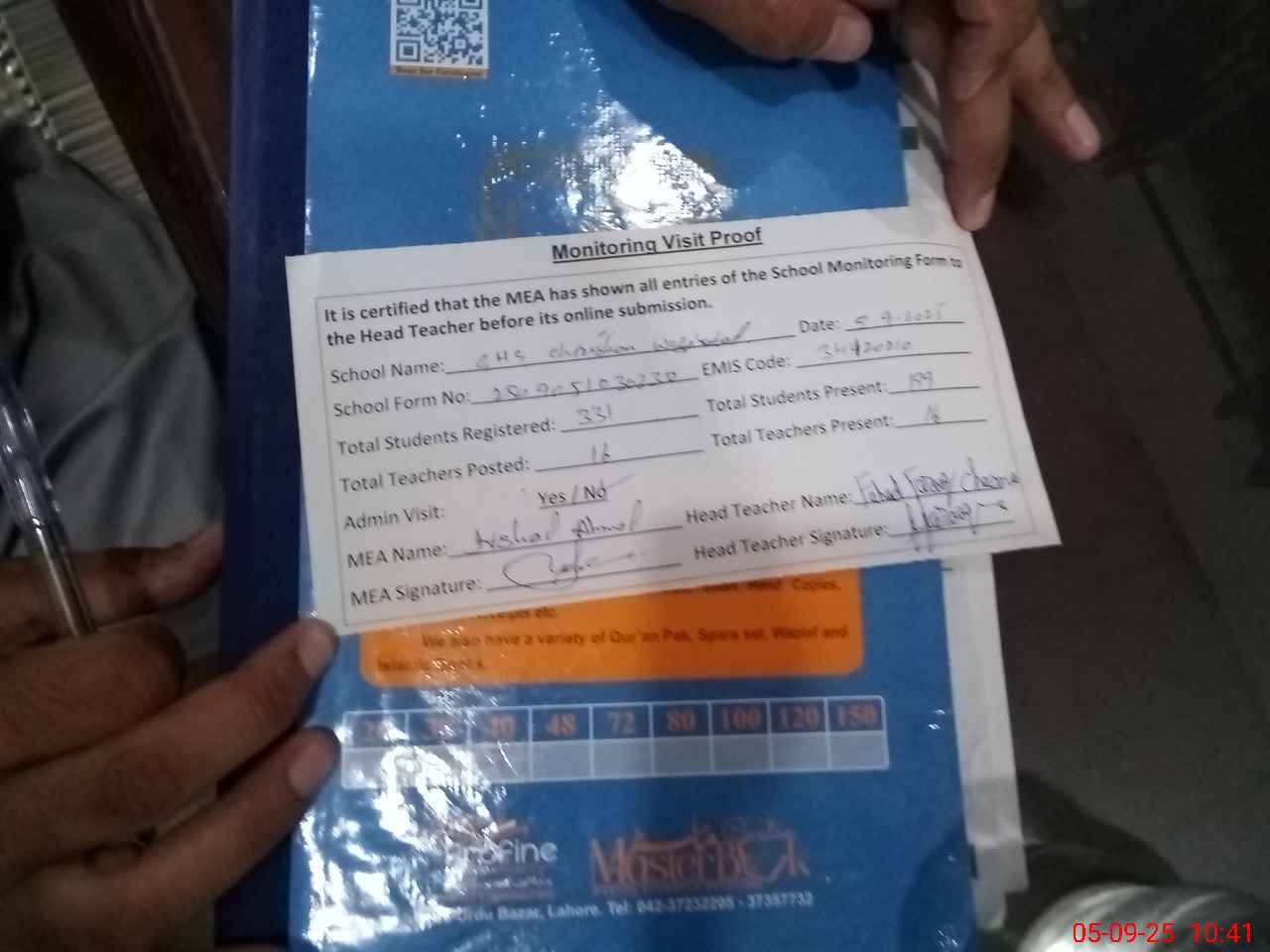 | Attendance Register | Head Teacher | MEA with School | Visit Proof |
