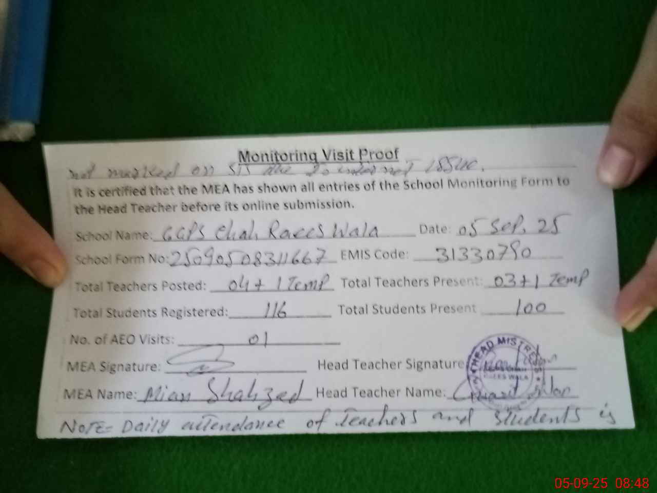 | Attendance Register | Head Teacher | MEA with School | Visit Proof |