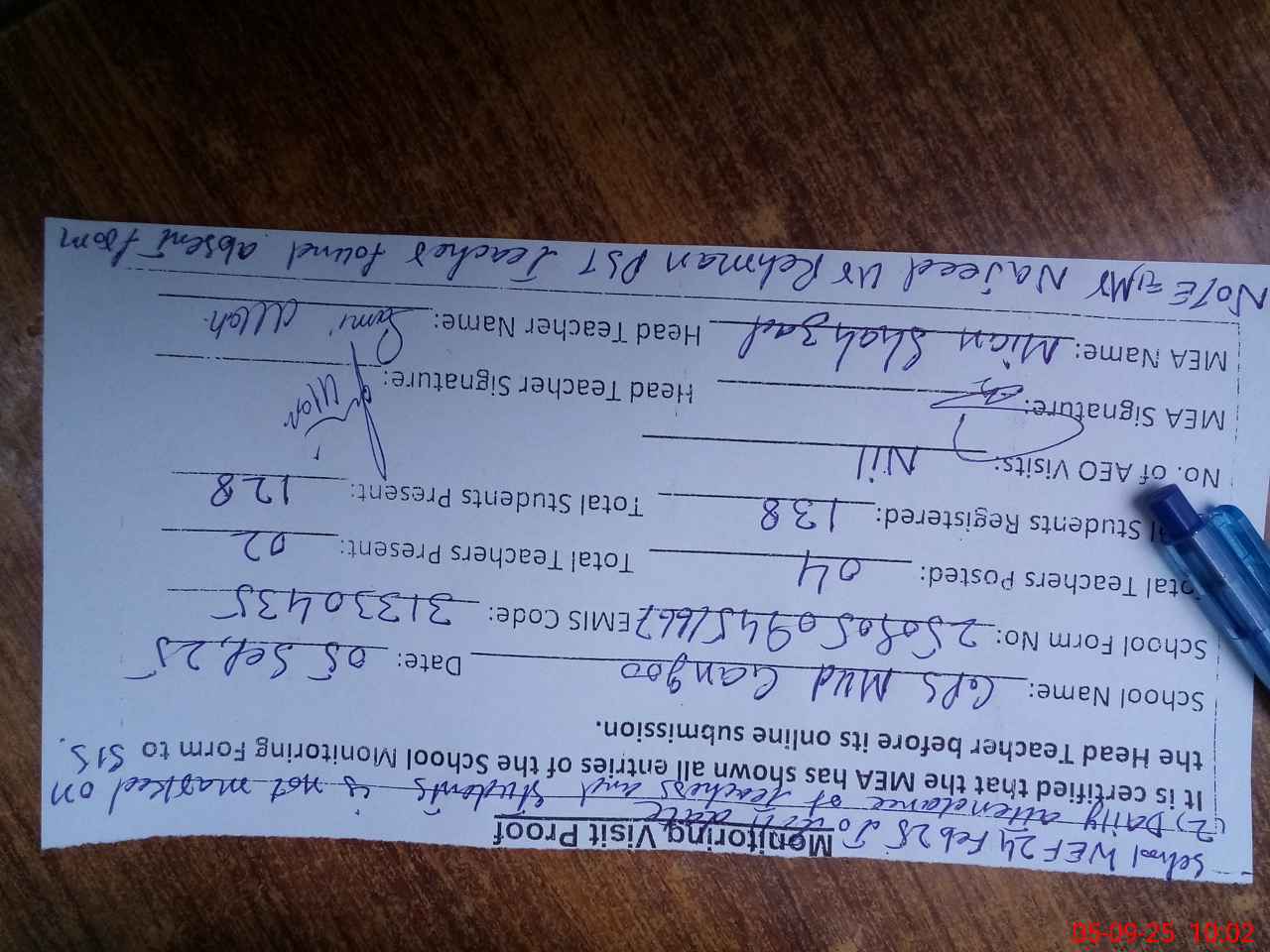 | Remarks (Use Separate Page if Required): 1 Mr Najeeb Ur Rehman PST teacher found absent from school WEF 24 February 2025 to till date 2 Daily attendance of teachers and students is not marked on SIS | |||||
