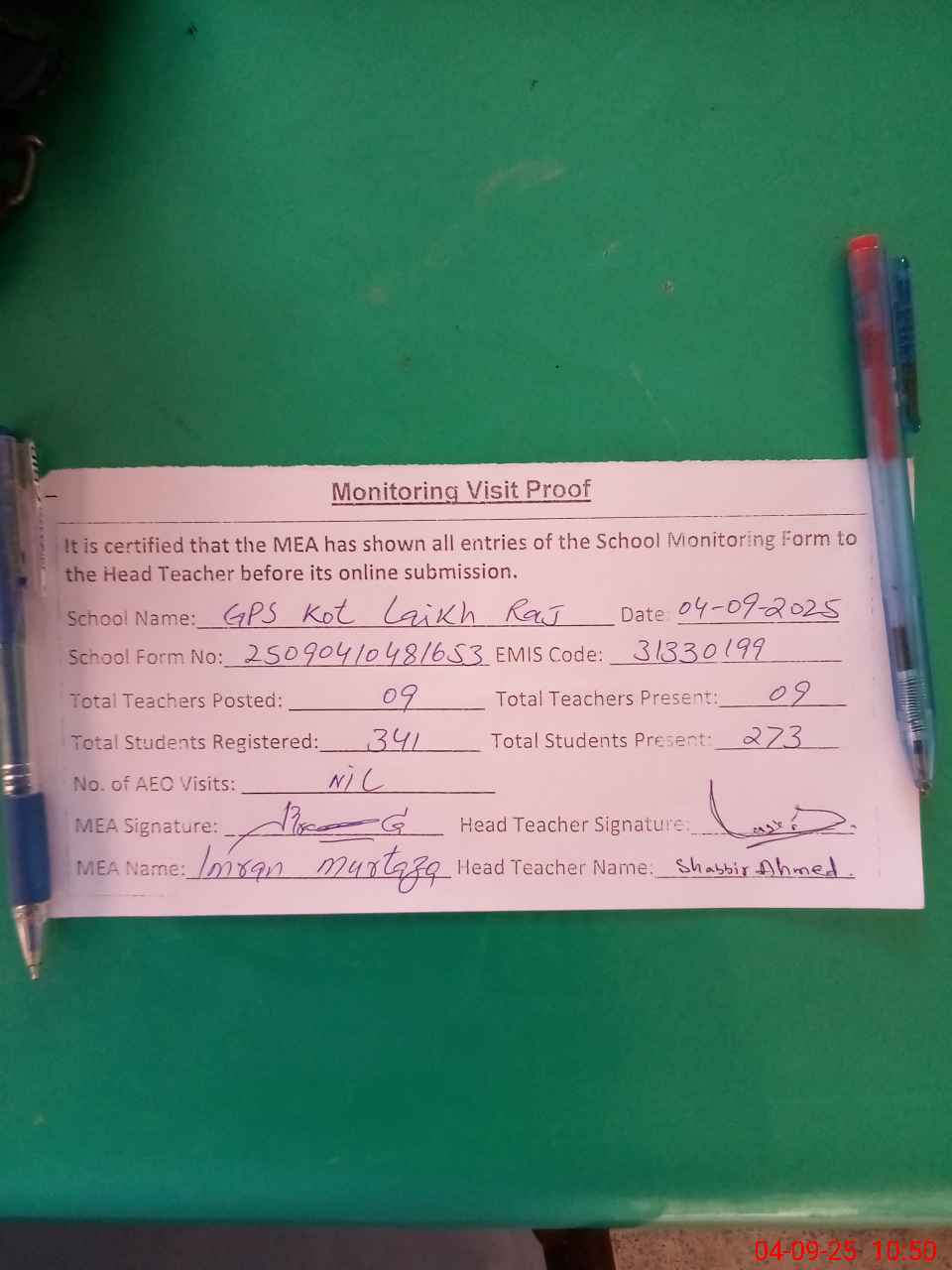 | Attendance Register | Head Teacher | MEA with School | Visit Proof |