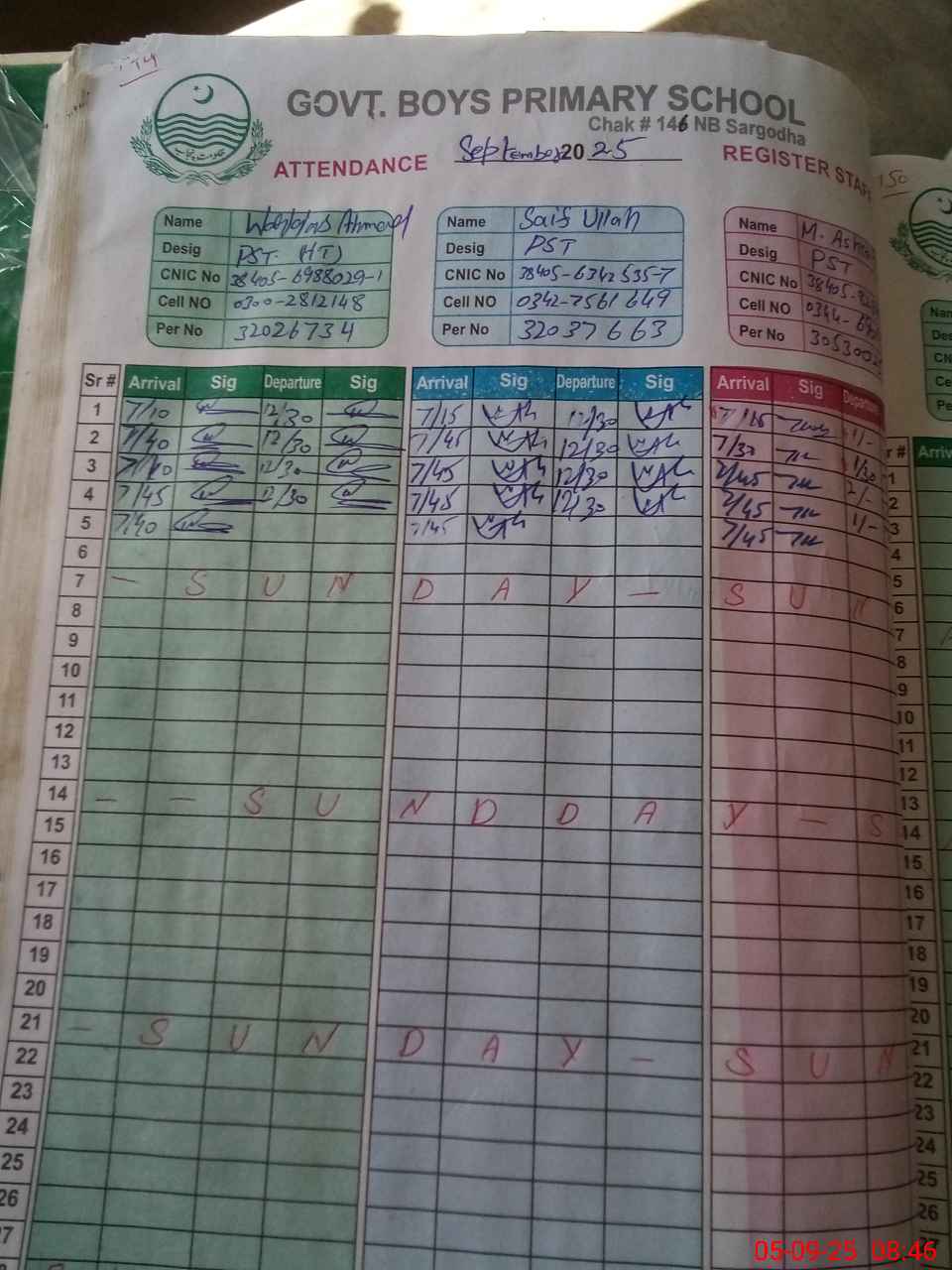 | CNIC | Full Name | Designation | R/C | Absence during last cal. month |