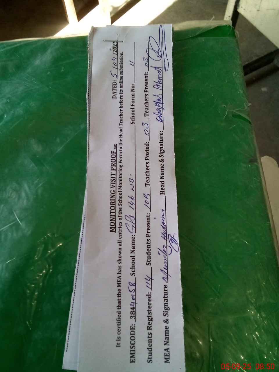 | Attendance Register | Head Teacher | MEA with School | Visit Proof |
