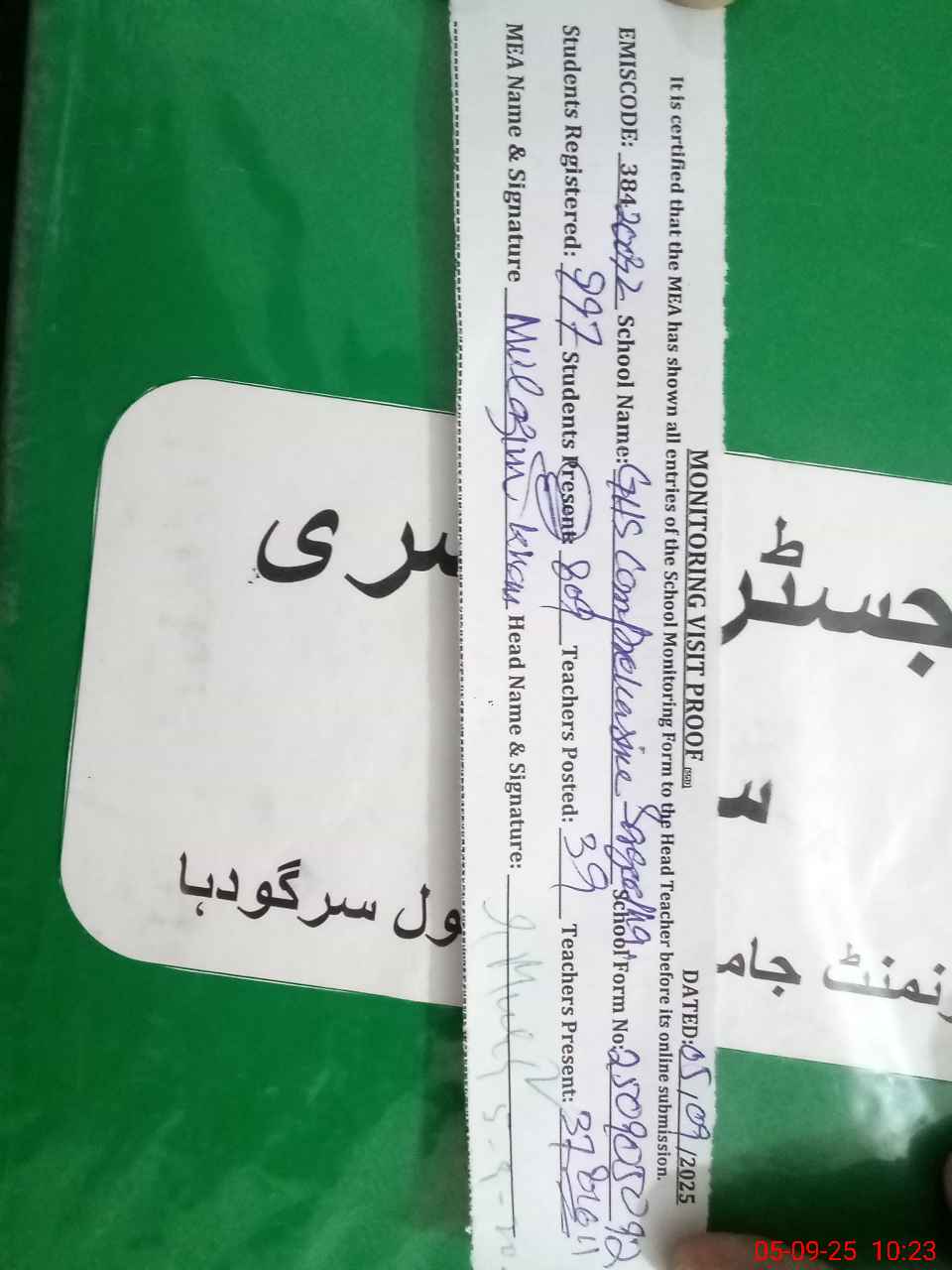 | Attendance Register | Head Teacher | MEA with School | Visit Proof |