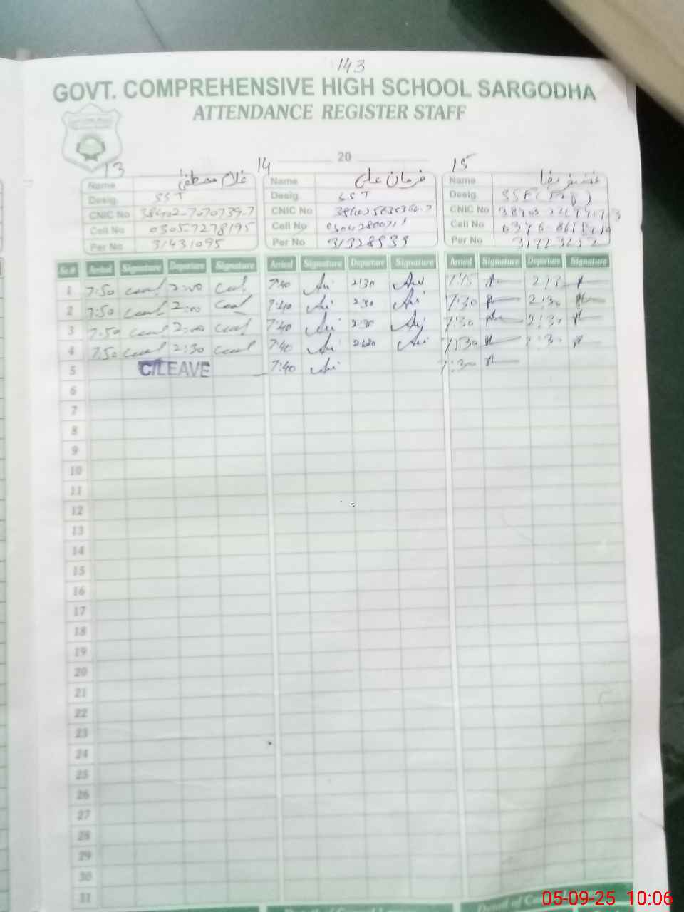 | CNIC | Full Name | Designation | R/C | Absence during last cal. month |