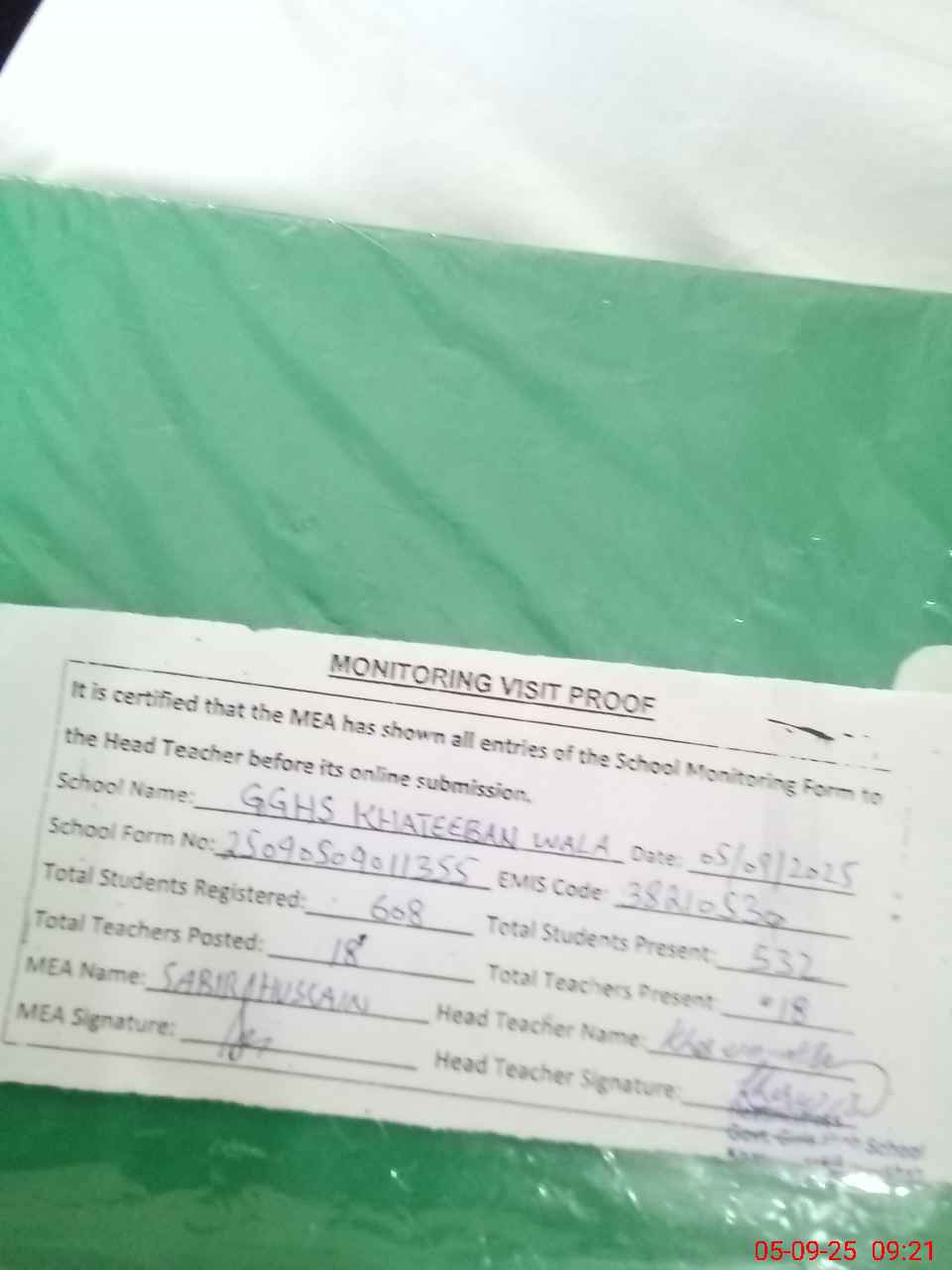 | Attendance Register | Head Teacher | MEA with School | Visit Proof |
