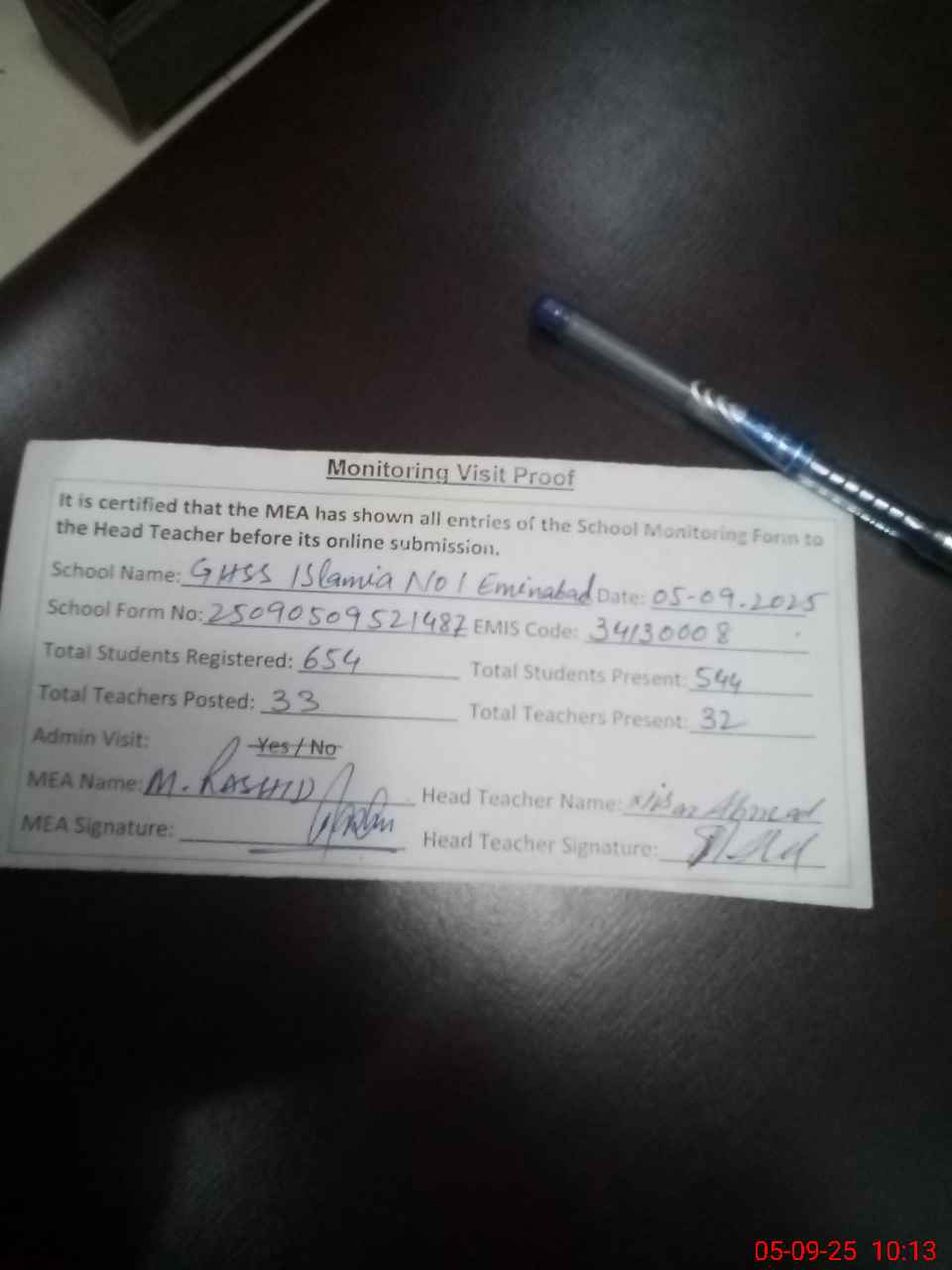 | Attendance Register | Head Teacher | MEA with School | Visit Proof |