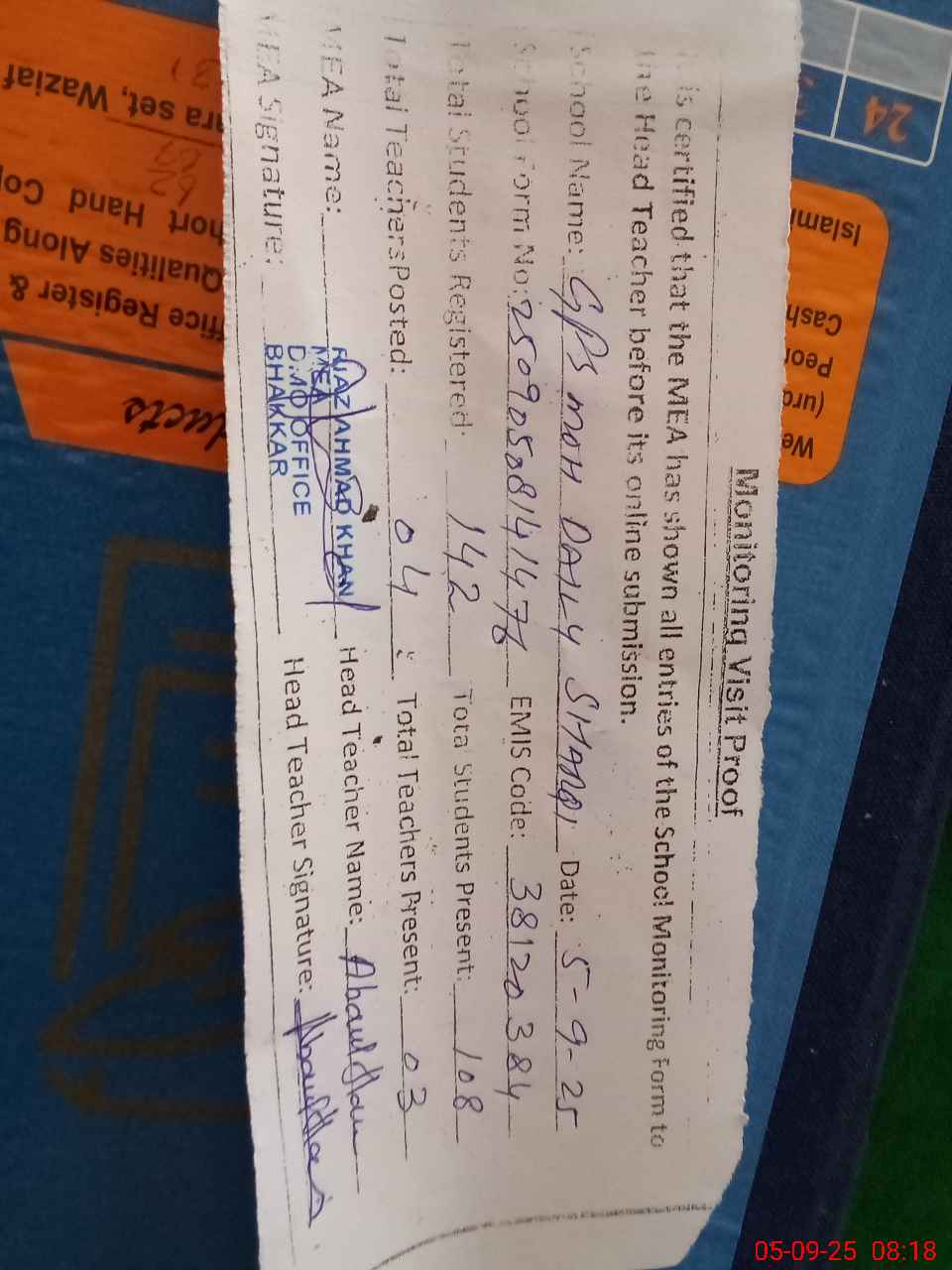 | Attendance Register | Head Teacher | MEA with School | Visit Proof |