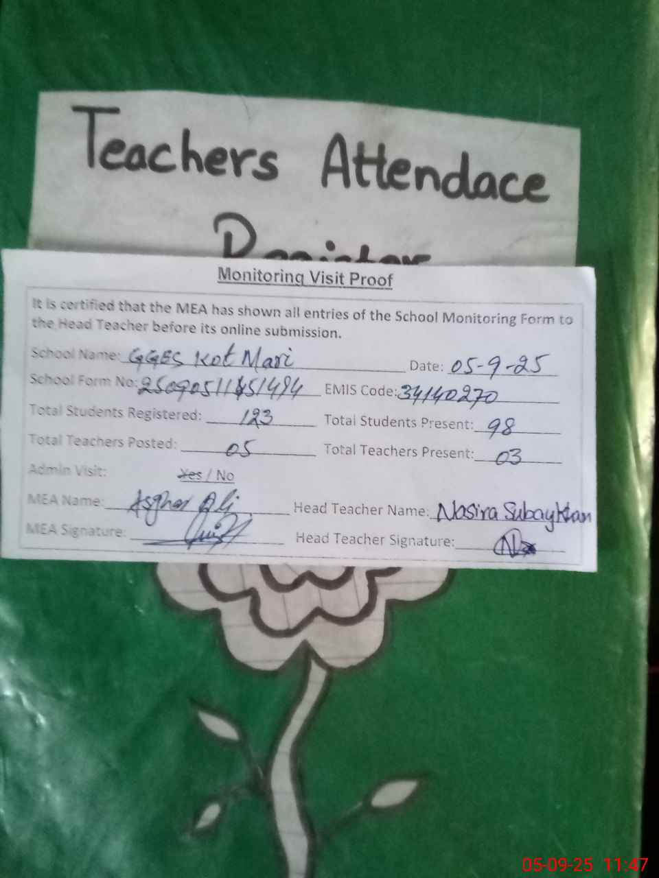 | Attendance Register | Head Teacher | MEA with School | Visit Proof |
