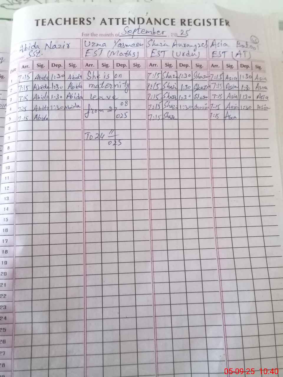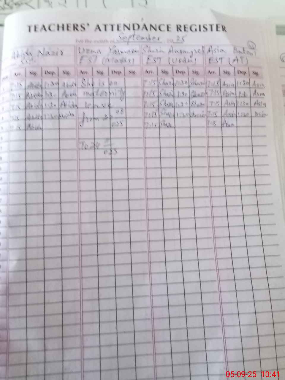 | 37**** | Uz**** Ya**** | EST | Regular | 0 | 0 | 0 | 0 | 0 | 0 | 0 | 0 | 0 | Maternity |