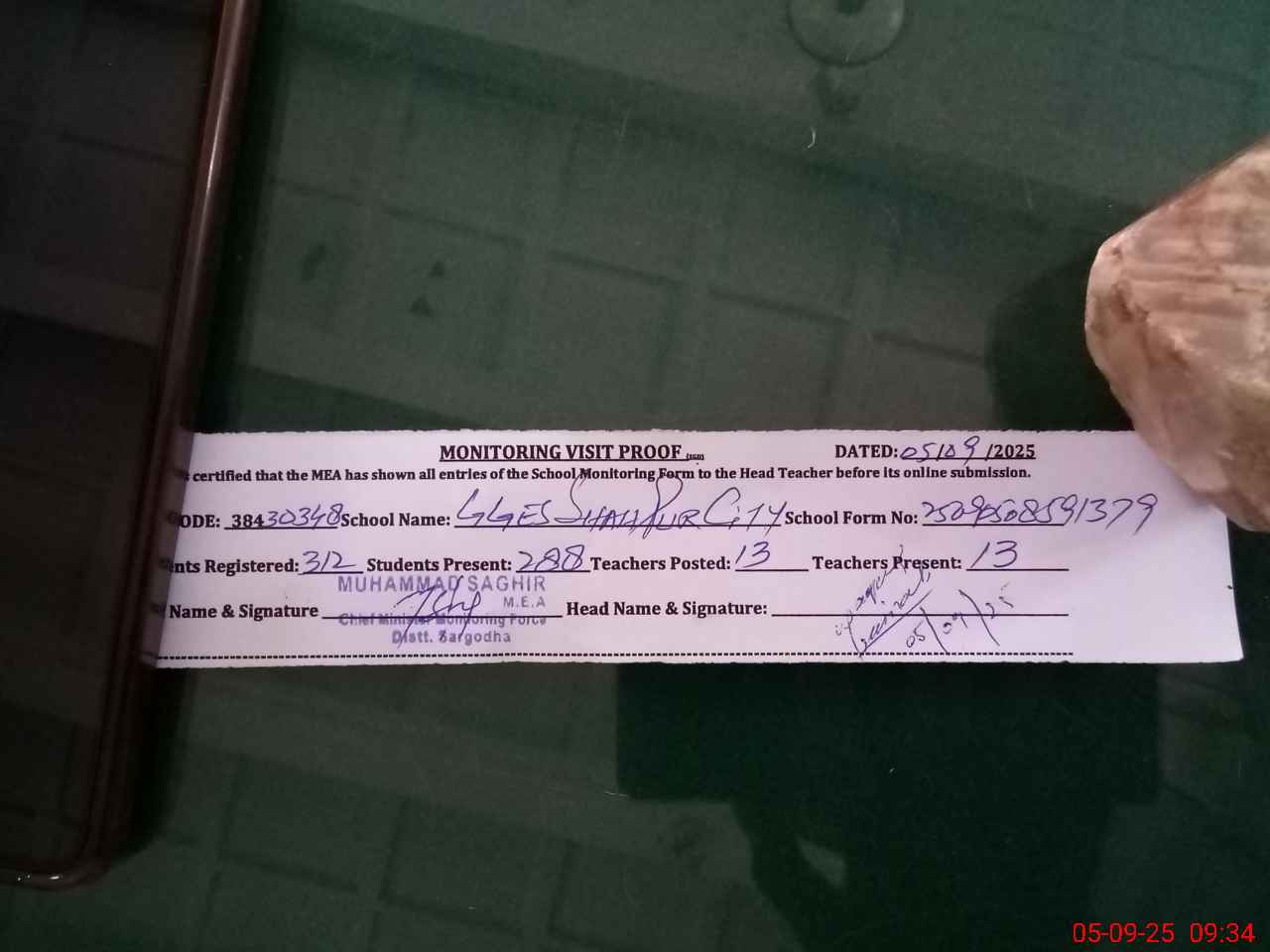| Attendance Register | Head Teacher | MEA with School | Visit Proof |