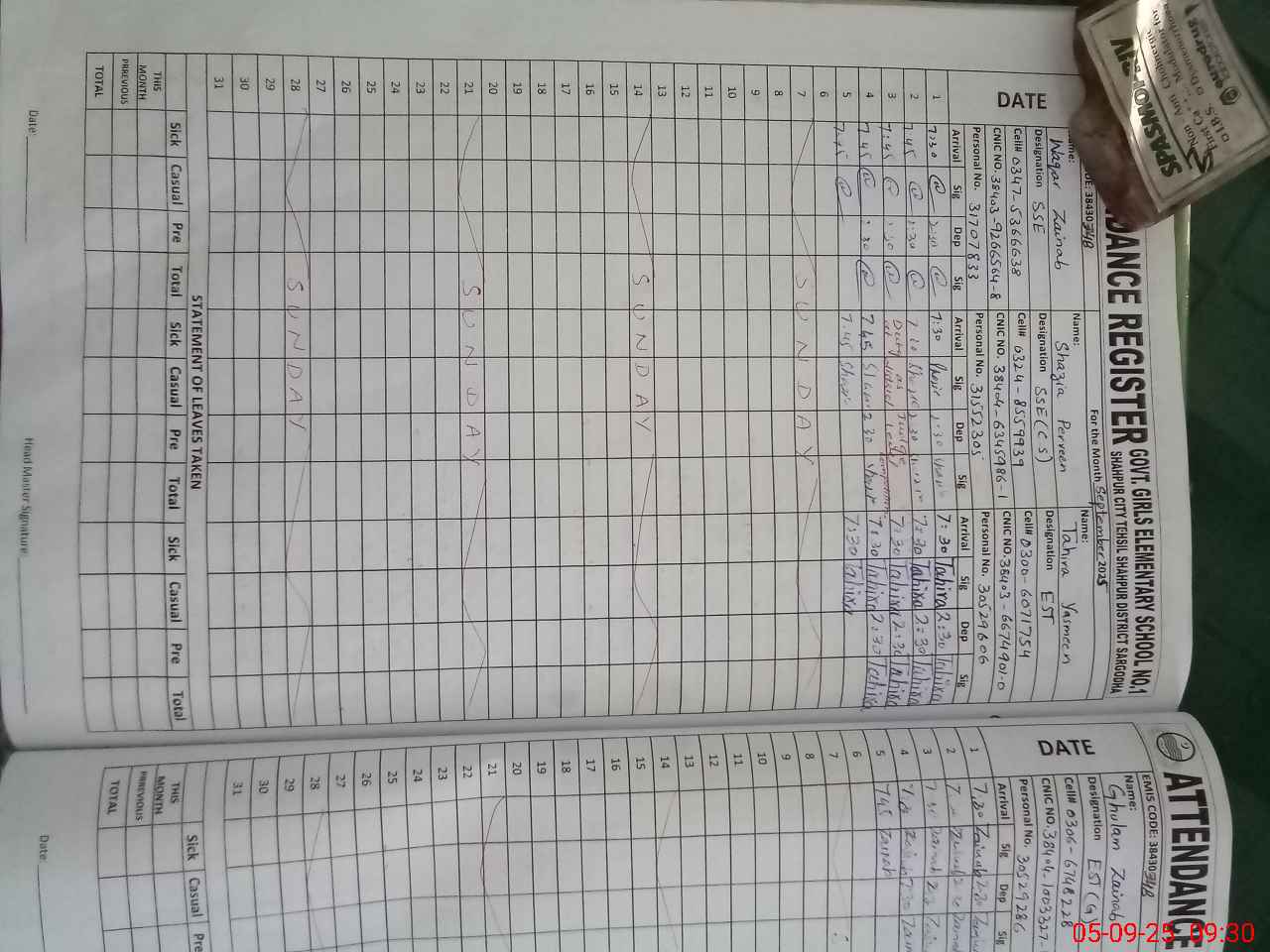 | CNIC | Full Name | Designation | R/C | Absence During Last Calender Month |