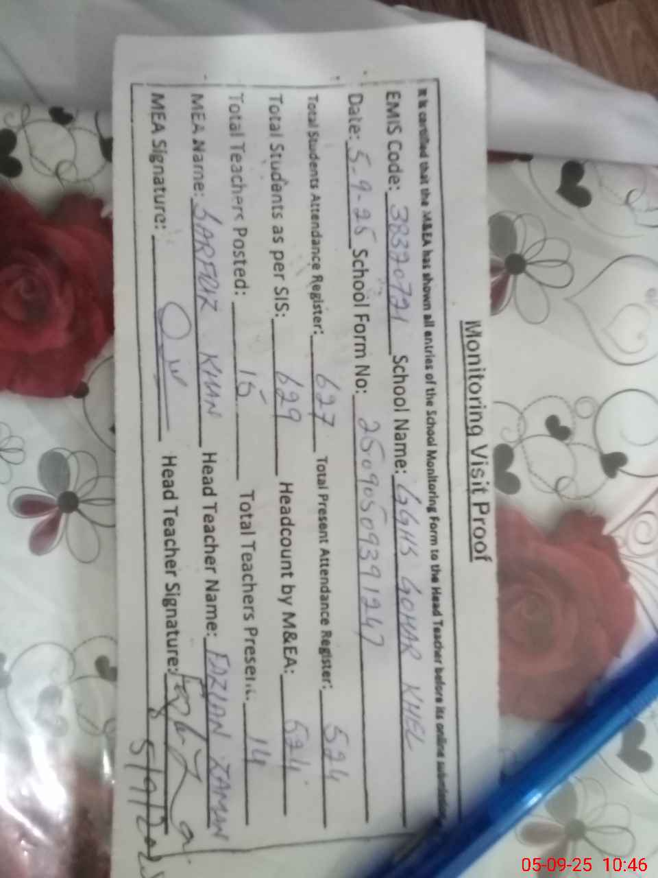 | Attendance Register | Head Teacher | MEA with School | Visit Proof |