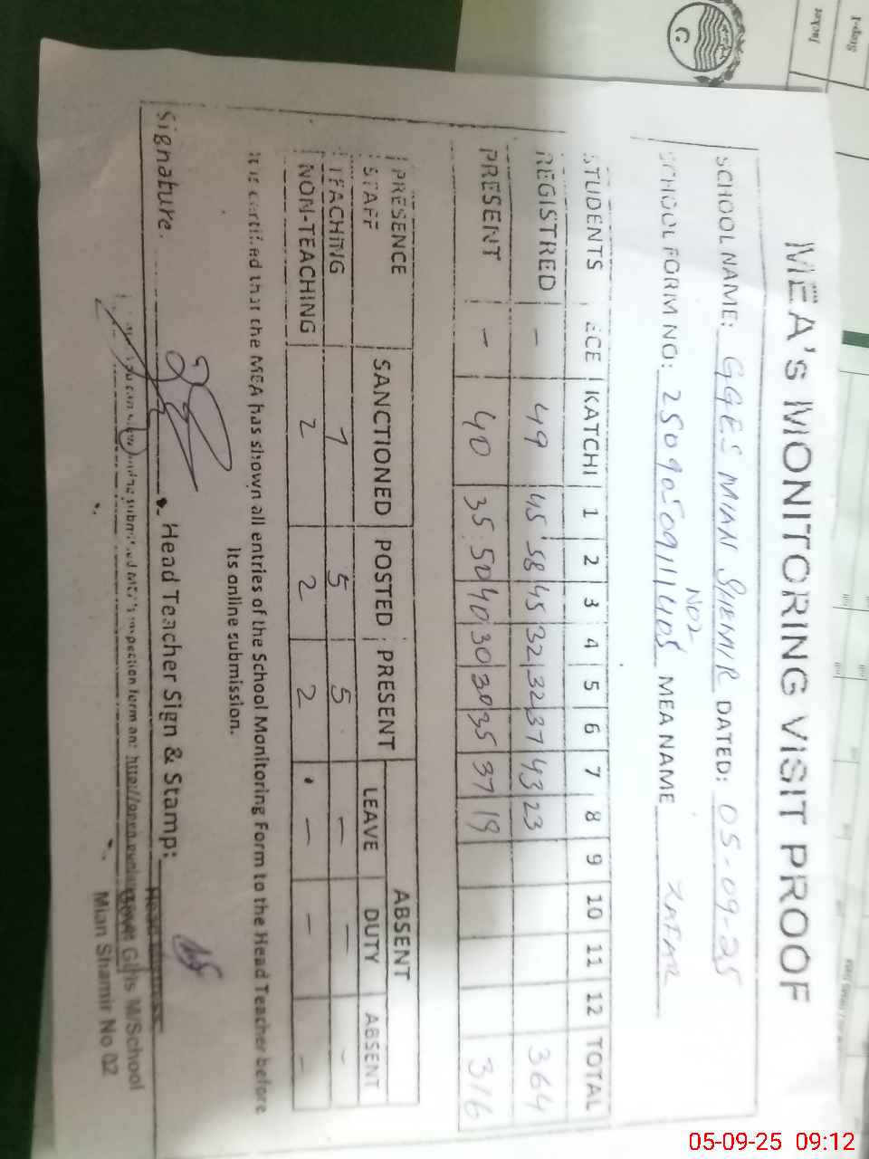 | Attendance Register | Head Teacher | MEA with School | Visit Proof |