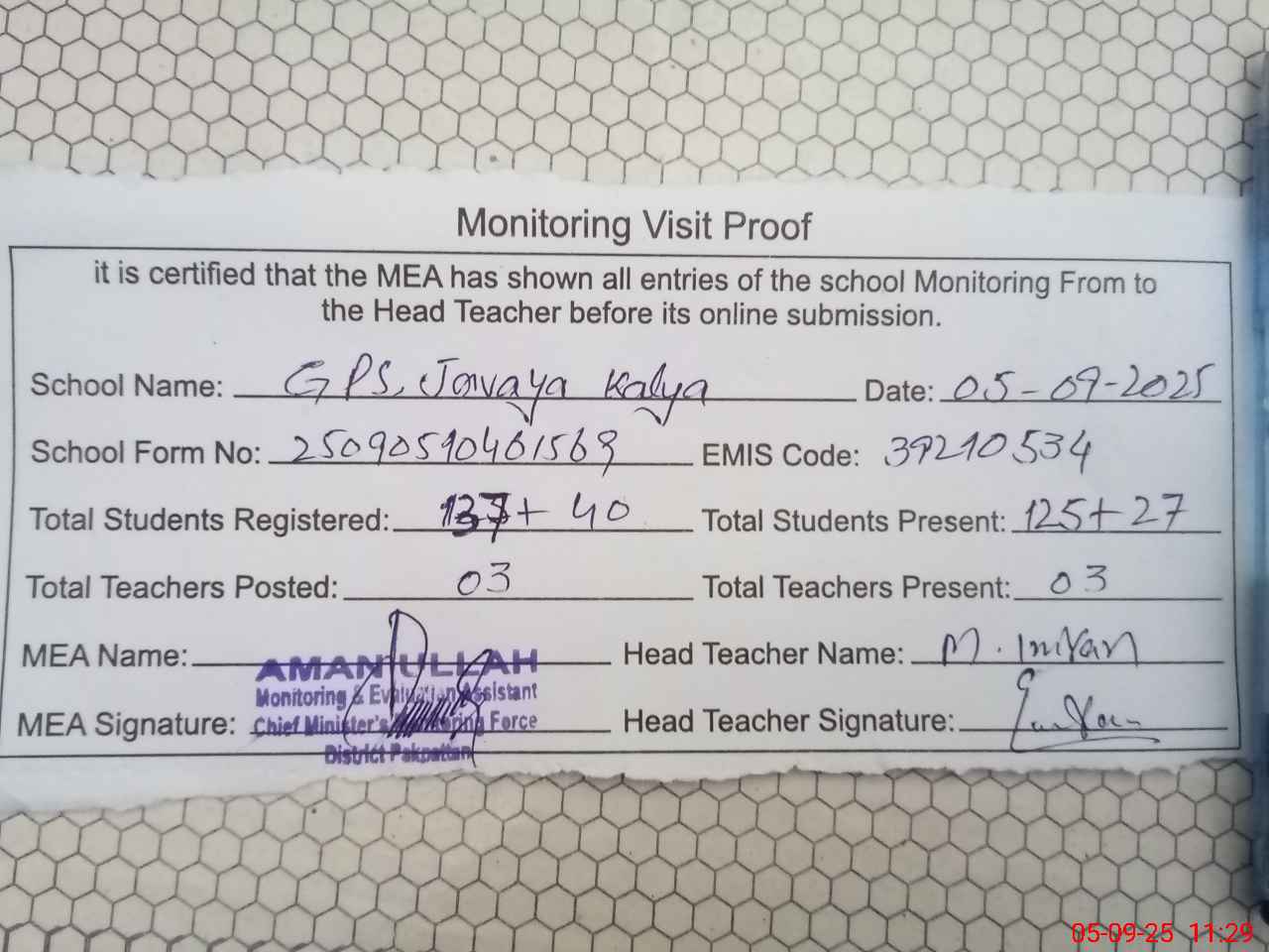 | Attendance Register | Head Teacher | MEA with School | Visit Proof |