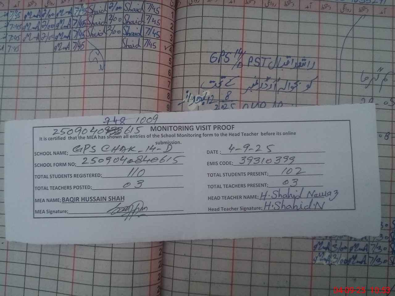| EMIS Code: 39310399 | Name of School: GPS CHAK NO 14-D | |||