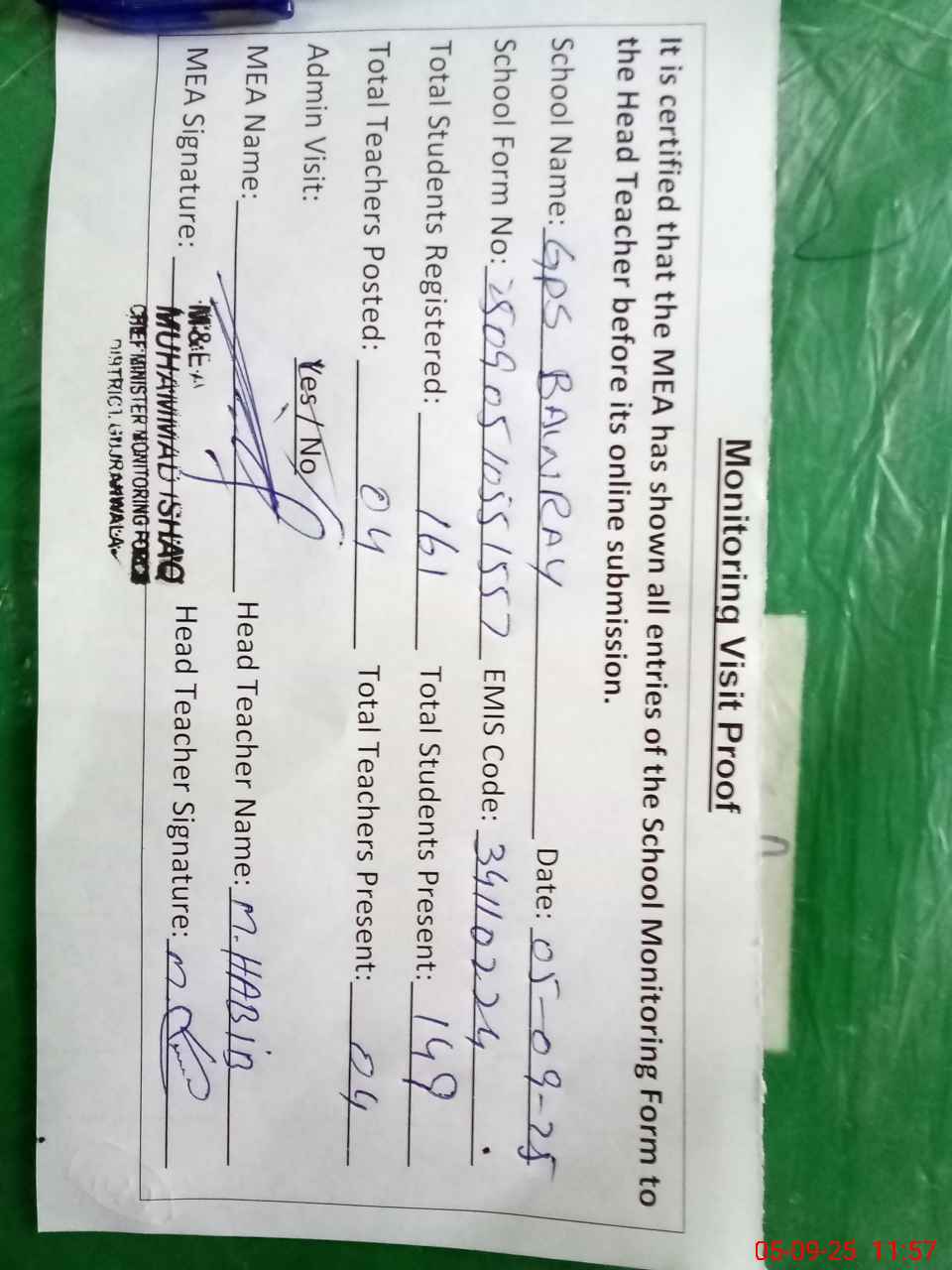 | Attendance Register | Head Teacher | MEA with School | Visit Proof |
