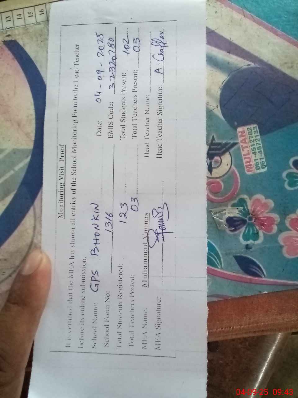 | EMIS Code: 32320780 | Name of School: GPS BHONKIN WALI | |||
