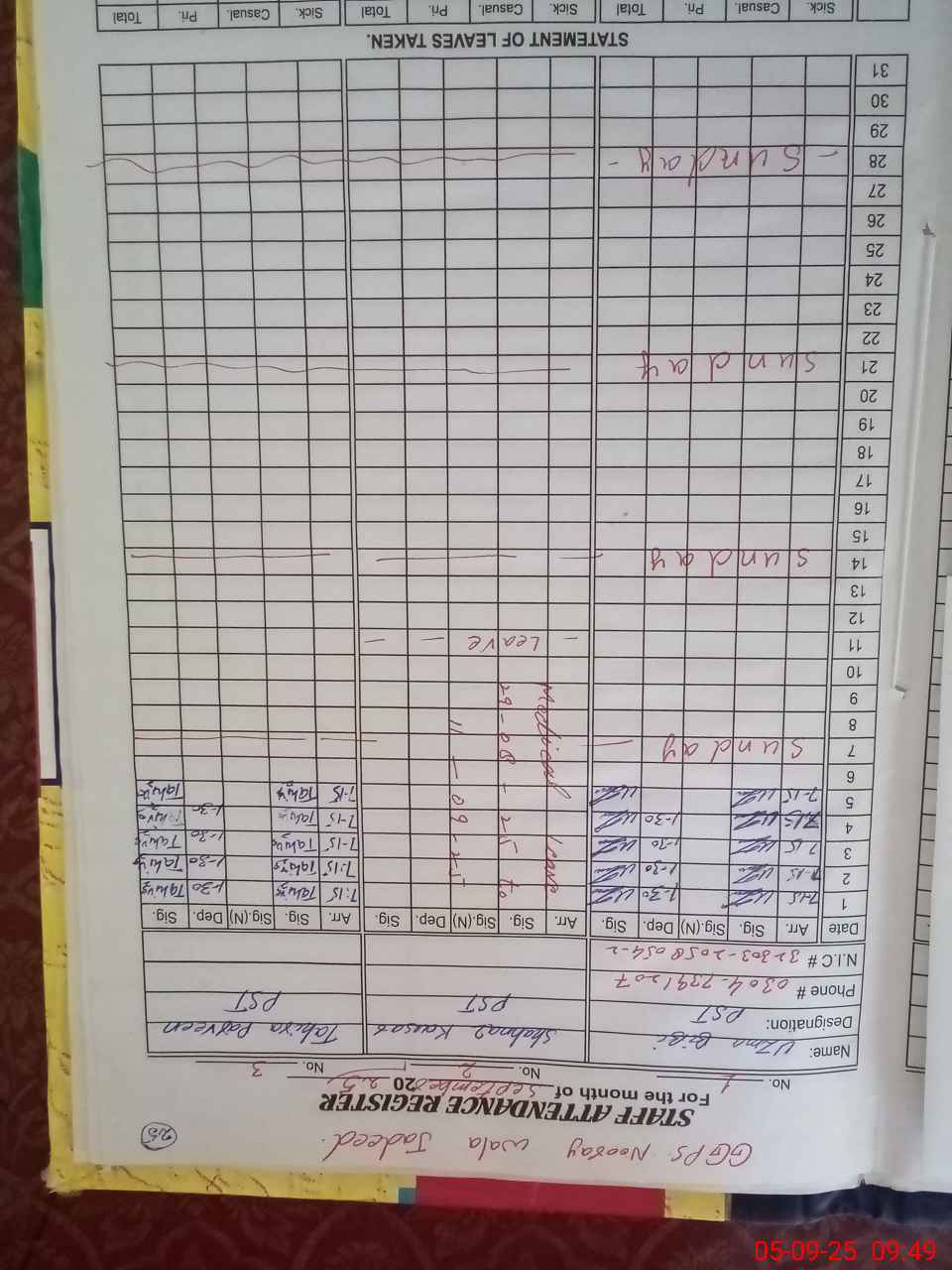 | CNIC | Full Name | Designation | R/C | Absence during last cal. month |