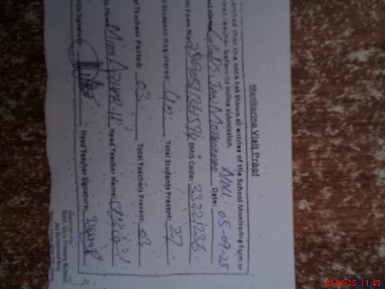 | Attendance Register | Head Teacher | MEA with School | Visit Proof |