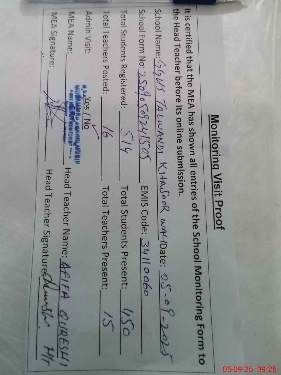 | Attendance Register | Head Teacher | MEA with School | Visit Proof |