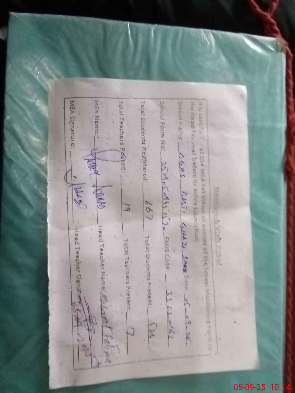 | Attendance Register | Head Teacher | MEA with School | Visit Proof |