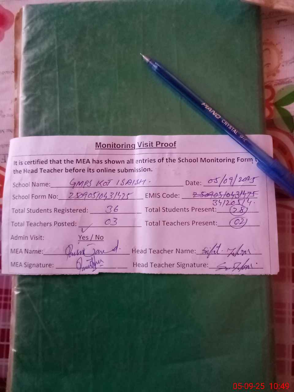 | Attendance Register | Head Teacher | MEA with School | Visit Proof |