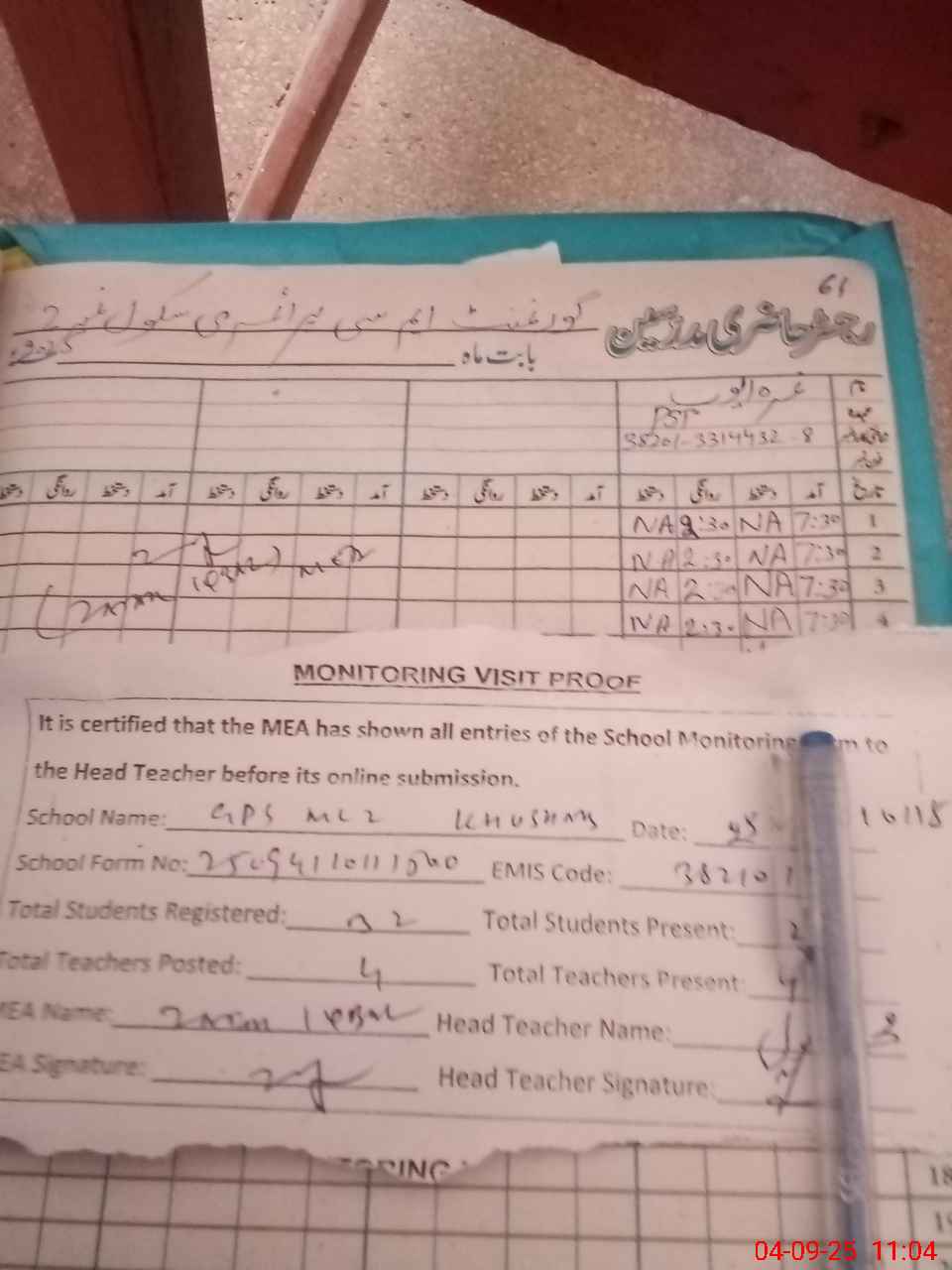| Attendance Register | Head Teacher | MEA with School | Visit Proof |