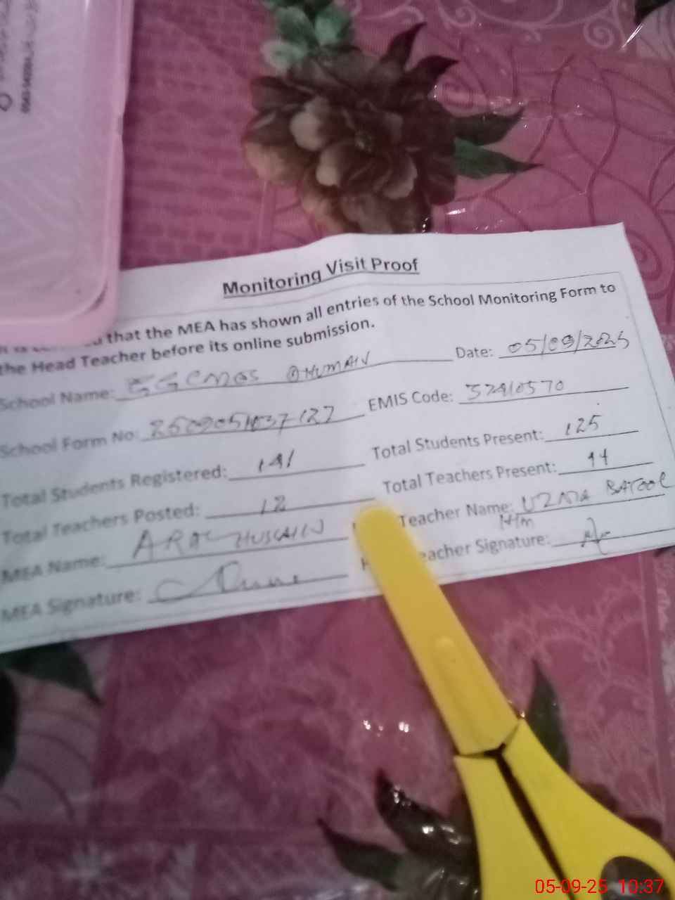 | Attendance Register | Head Teacher | MEA with School | Visit Proof |