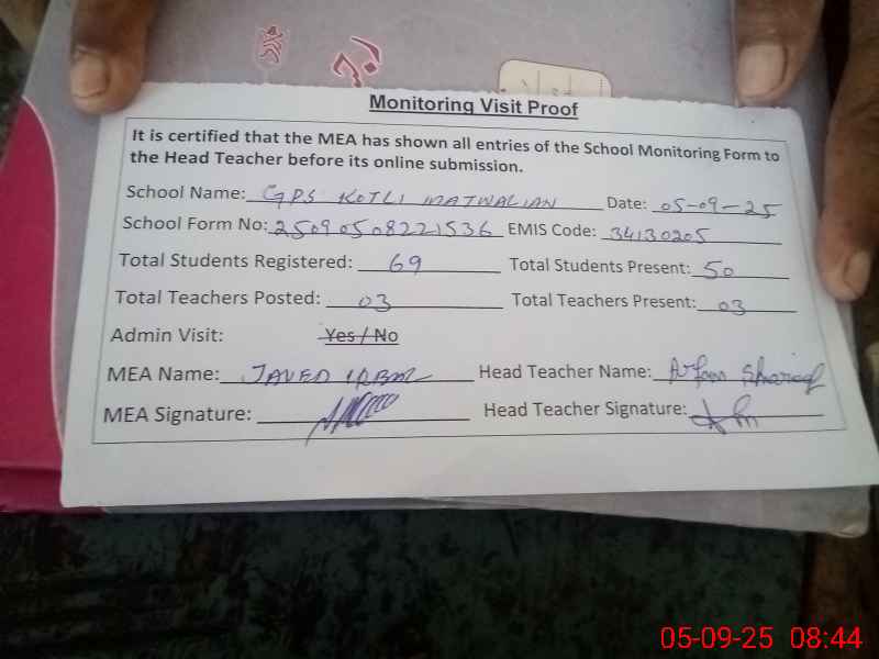 | EMIS Code: 34130205 | Name of School: GPS KOTLI MATWALIAN | |||