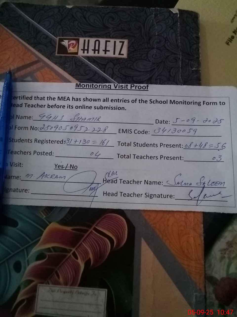 | Attendance Register | Head Teacher | MEA with School | Visit Proof |