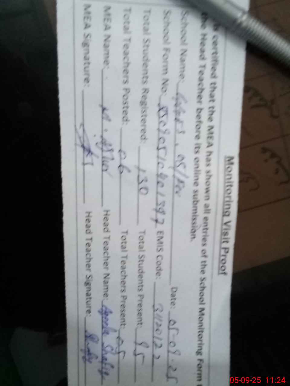 | Attendance Register | Head Teacher | MEA with School | Visit Proof |