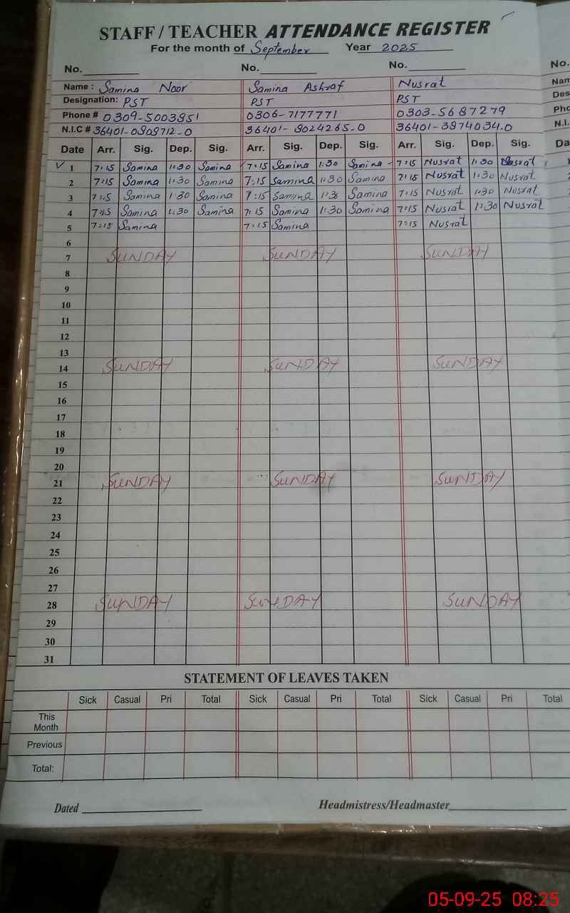 | CNIC | Full Name | Designation | R/C | Absence During Last Calender Month |