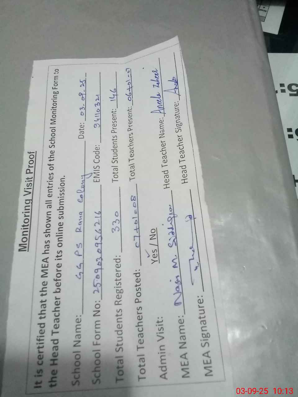| Attendance Register | Head Teacher | MEA with School | Visit Proof |