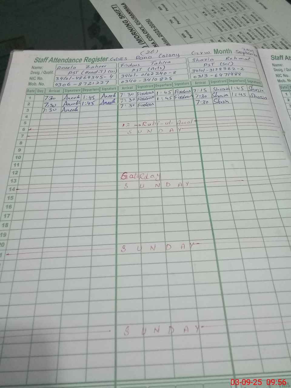 | CNIC | Full Name | Designation | R/C | Absence During Last Calender Month |