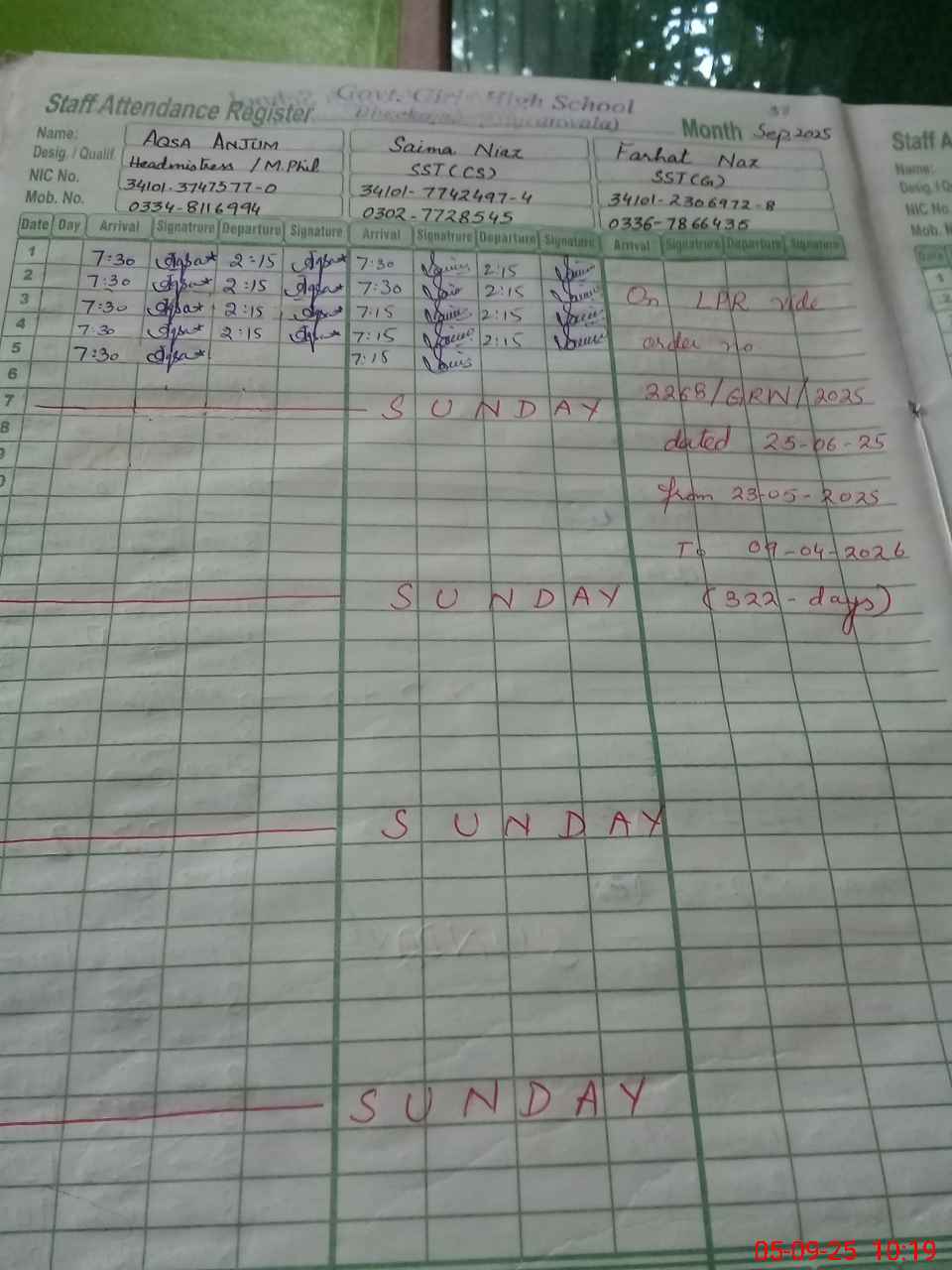 | Name: AQ**** AN**** Designation: (School Headmaster's/Headmistress's) Headmistress Phone/Cell Number: 03**** |