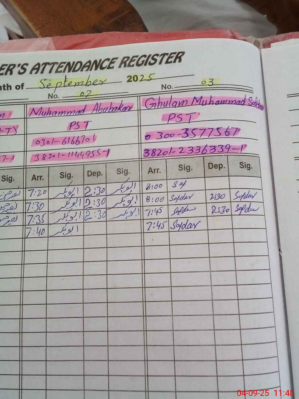 | CNIC | Full Name | Designation | R/C | Absence during last cal. month |