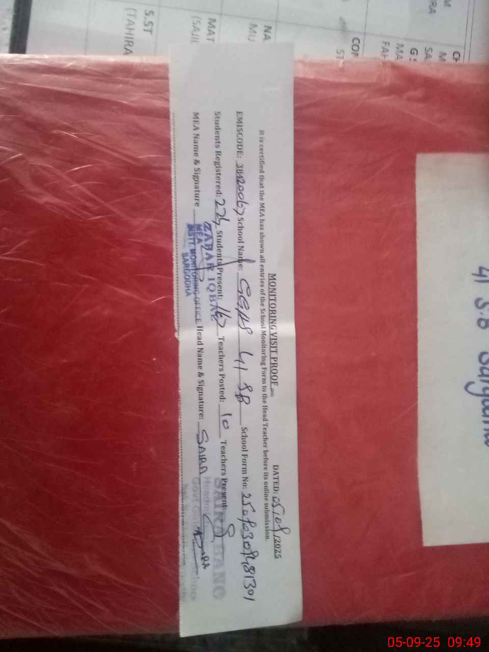 | Monitoring Date: 05-09-2025 | Start Time: 05-09-2025 09:15 AM | End Time: 05-09-2025 09:50 AM | Name of MEA: ZA**** IQ**** | |