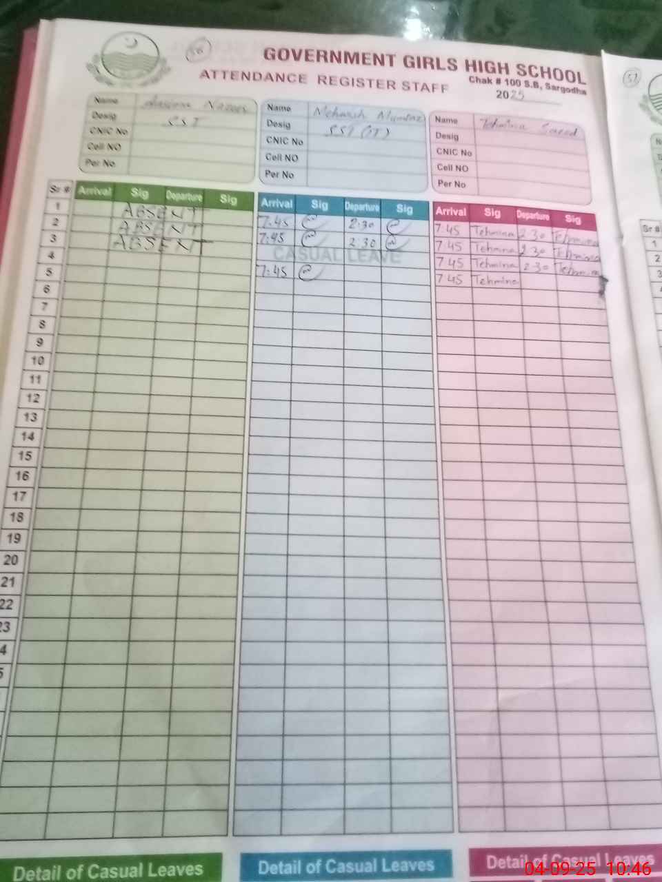 | CNIC | Full Name | Designation | R/C | Absence During Last Calender Month |