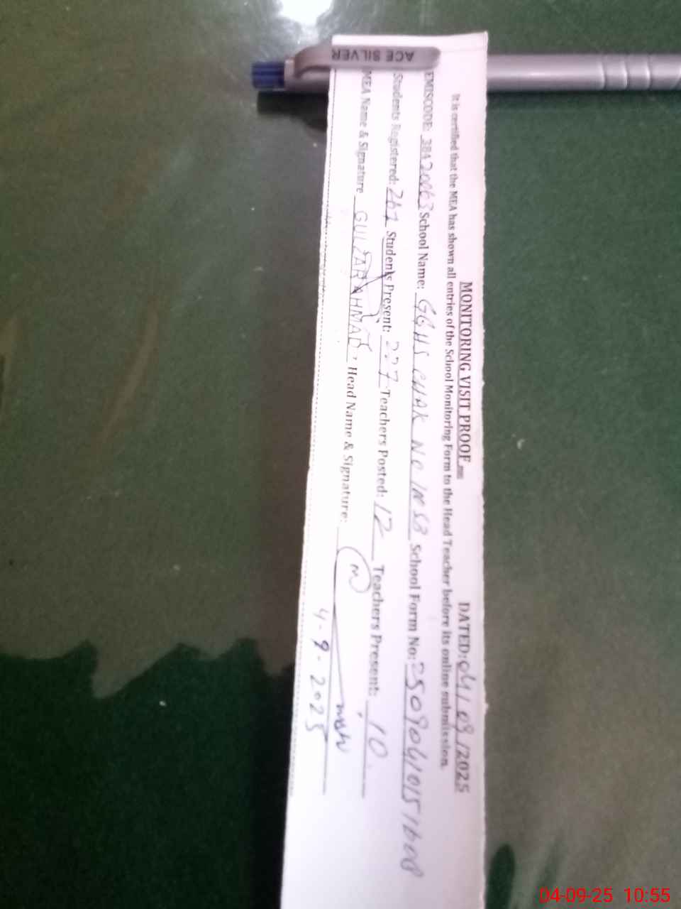 | Attendance Register | Head Teacher | MEA with School | Visit Proof |