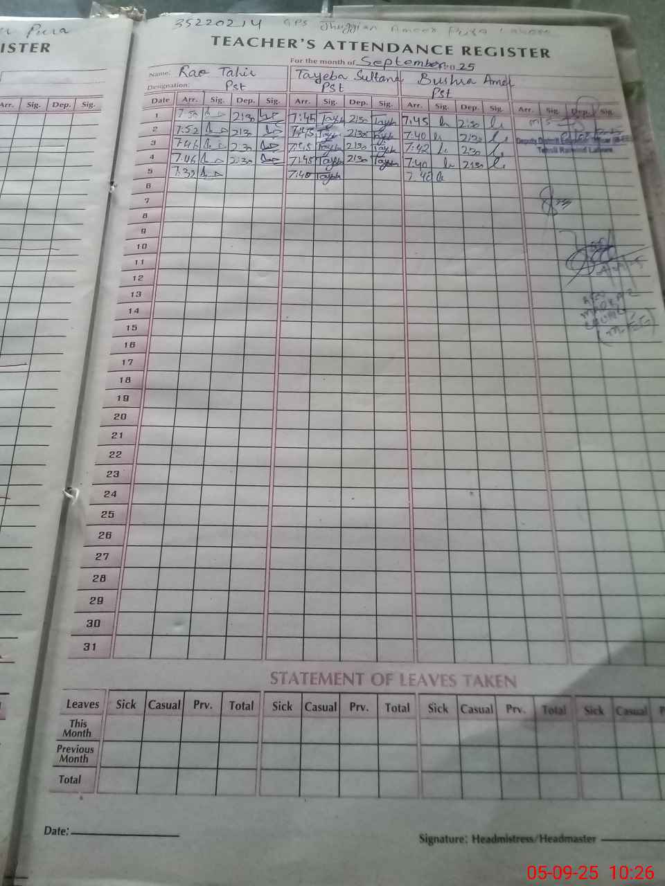 | Total no. of Classrooms: 10 No. of Classrooms Used for Teaching: 6 No. of Classrooms Storing Old Furniture, FTBs, etc: 0Comments if Any: ESE Teacher Zafar Iqbal removed from service since 6th August 2024 by order no 1846 E III but his name on SIS as well as in PMIU Monthly Monitoring application teaching staff list of said school is still exists Nursery students accommodated in ECE class r |