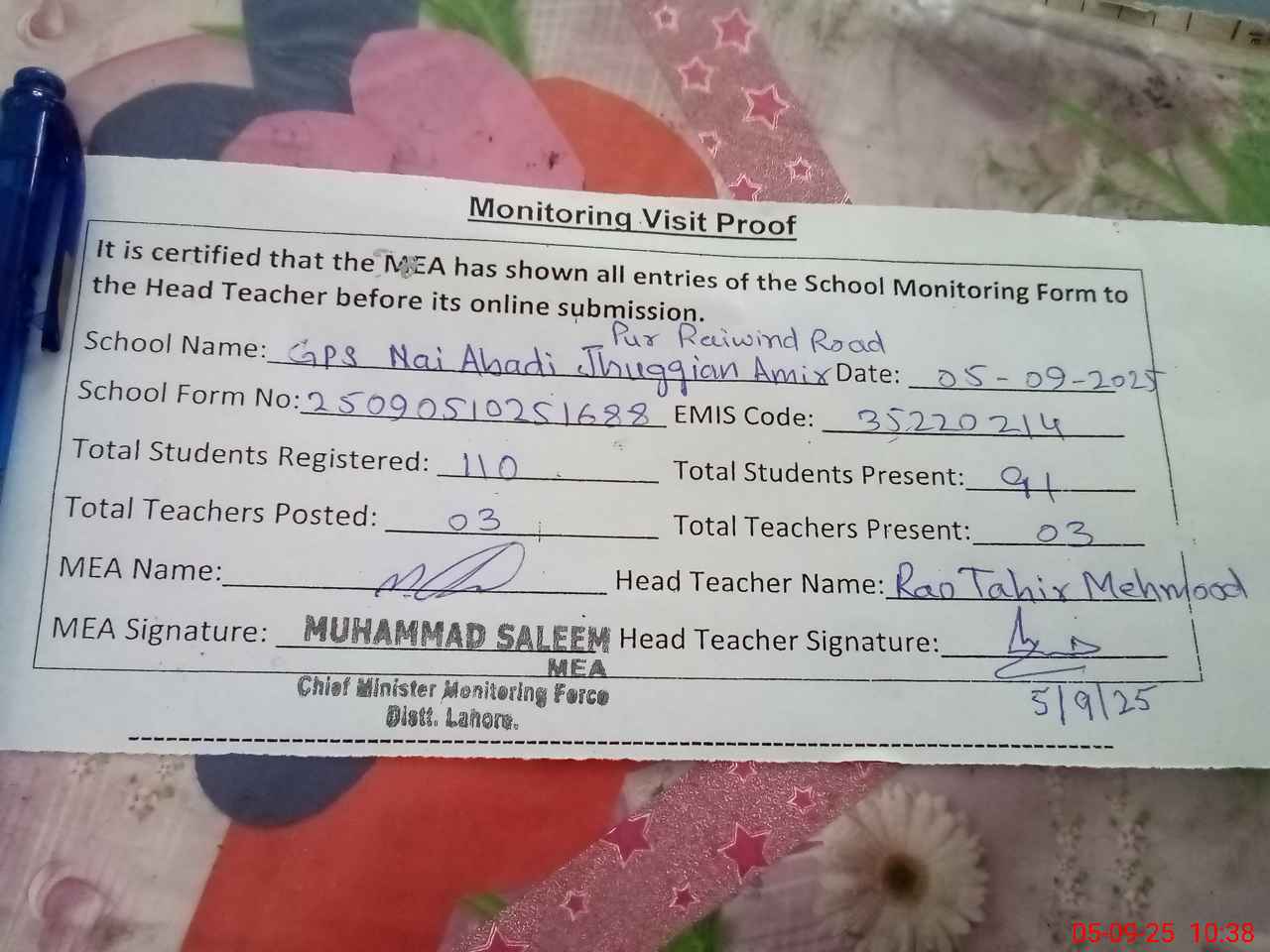 | EMIS Code: 35220214 | Name of School: GPS NAI ABADI JHUGIAN AMEERPUR RAIWIND ROAD | |||